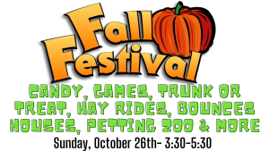 All our community is invited to join us on Sunday, October 26 for our Annual Fall Festival. Fun games, Petting Zoo, Bounce houses, Hay rides and lots of Candy for all the children (and adults too!)